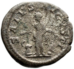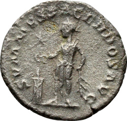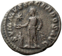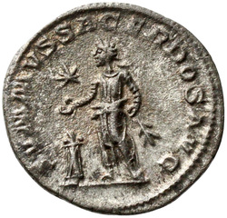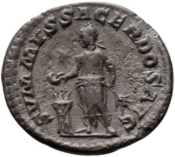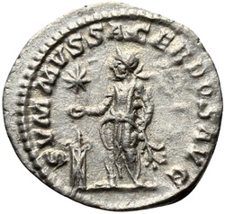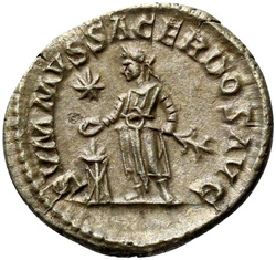 SVMMVS SACERDOS AVG, Elagabalus, in Syrian priestly robes, standing left, sacrificing out of patera in right hand over tripod, holding branch downwards in left hand; in field, star