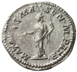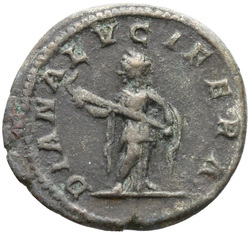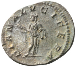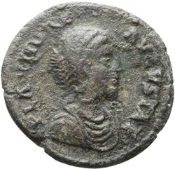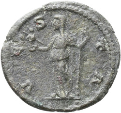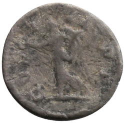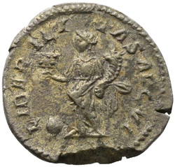 MATRI DEVM, Cybele, towered, draped, standing front, head left, holding drum in right hand and sceptre in left hand, resting left arm on column; at feet, left, lion