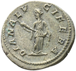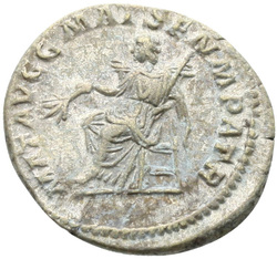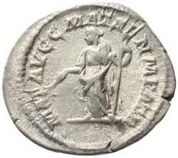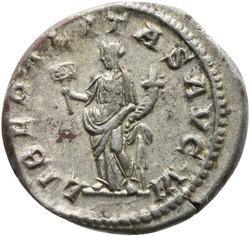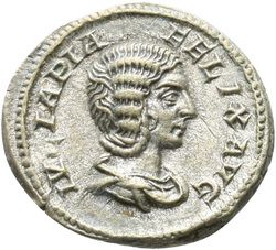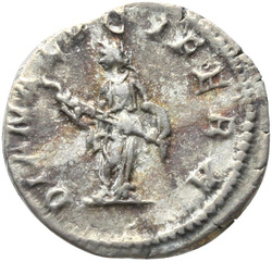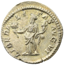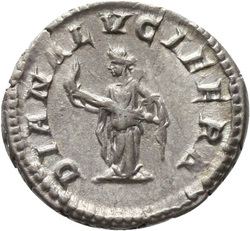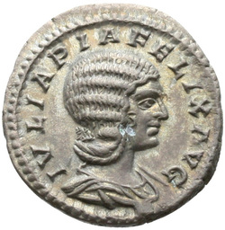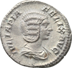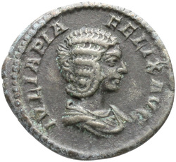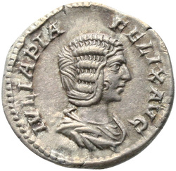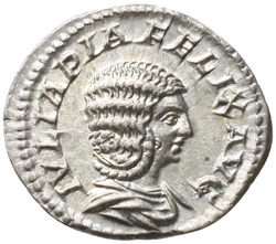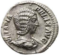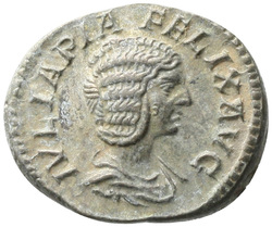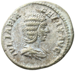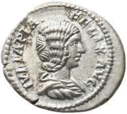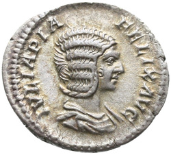 IVLIA PIA FELIX AVG, Bust of Julia Domna, hair waved in five ridges and coiled at back with queue at neck, draped, right