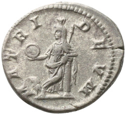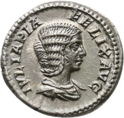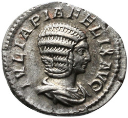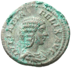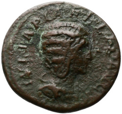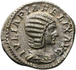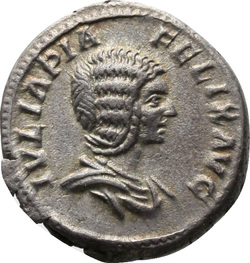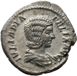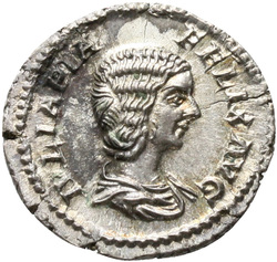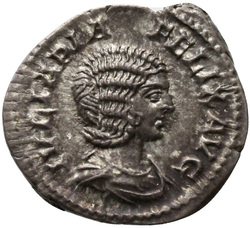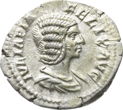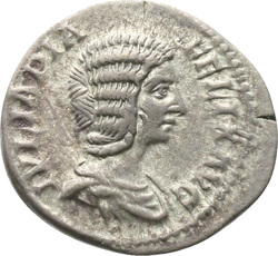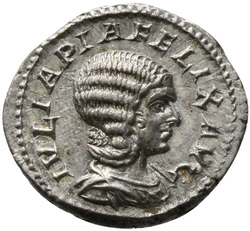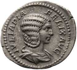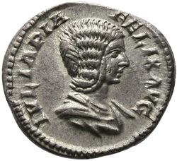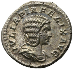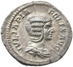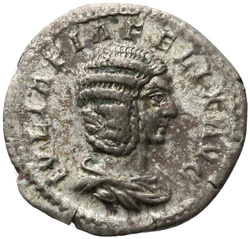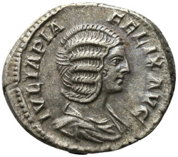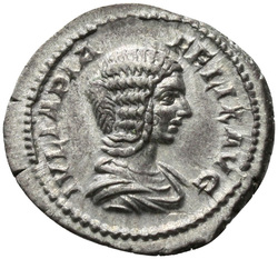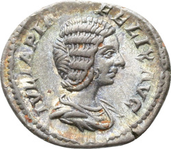 IVLIA PIA FELIX AVG, Bust of Julia Domna, hair waved in five ridges and coiled at back with queue at neck, draped, right
