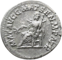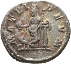 MATRI DEVM, Cybele, towered, draped, standing front, head left, holding drum in right hand and sceptre in left hand, resting left arm on column; at feet, left, lion