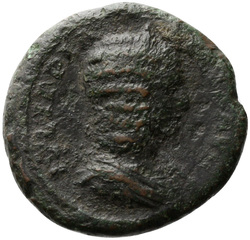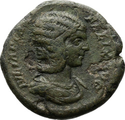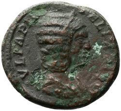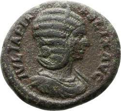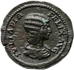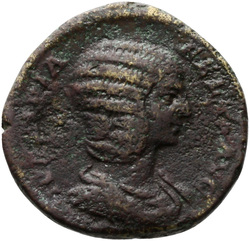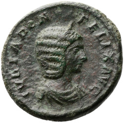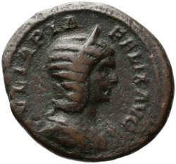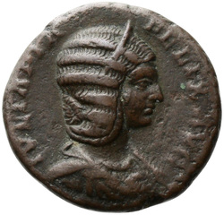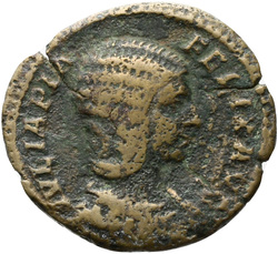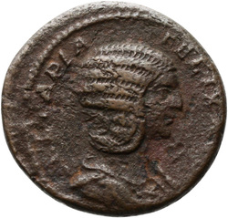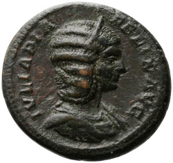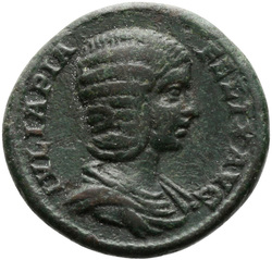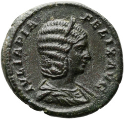 IVLIA PIA FELIX AVG, Bust of Julia Domna, hair waved in six ridges with queue at neck, diademed, draped, right