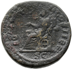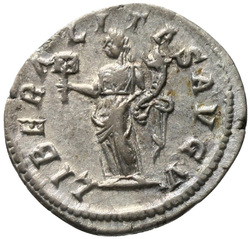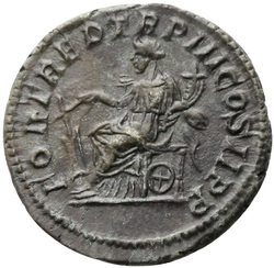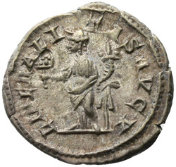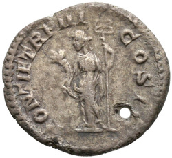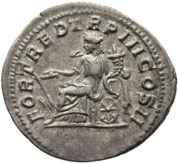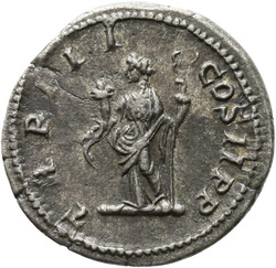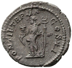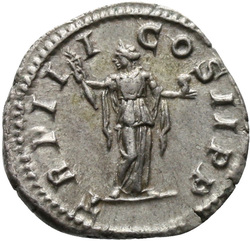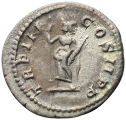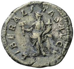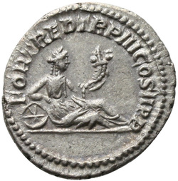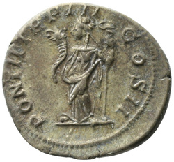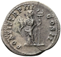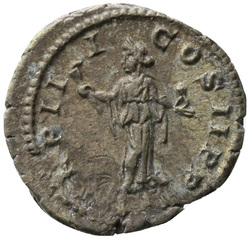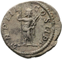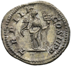 TR P III COS II P P, Janus, two-headed, standing front, looking left and right, naked to waist, drapery over left arm, holding sceptre in right hand and thunderbolt in left hand