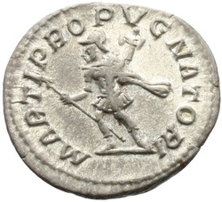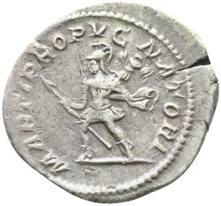 VENERI VICTRICI, Venus, draped, standing left, holding Victory in extended right hand and transverse sceptre in left hand, leaning on shield set on helmet
