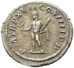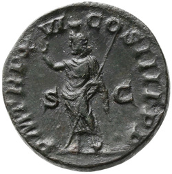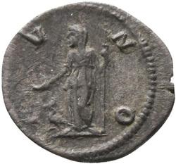 IVNO, Juno, veiled, draped, standing left, holding patera in extended right hand and sceptre in left hand; at feet, left, peacock