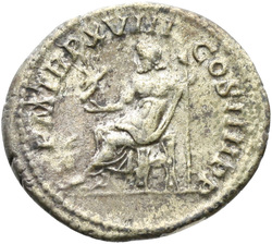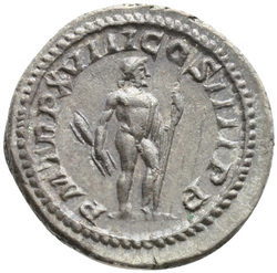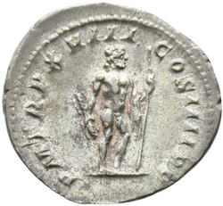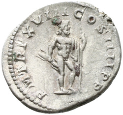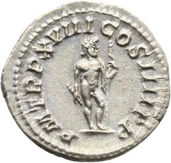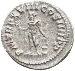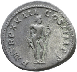 P M TR P XVIII COS IIII P P, Serapis, wearing polos on head, standing front, head left, raising right hand and holding transverse sceptre in left hand