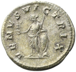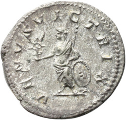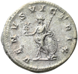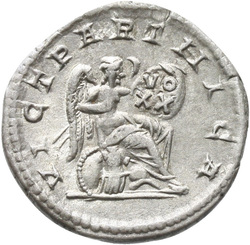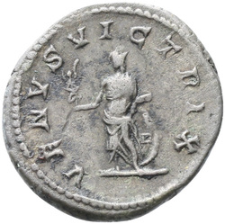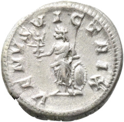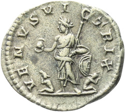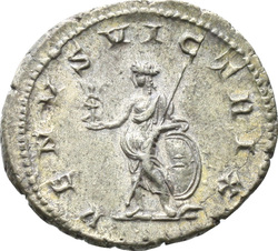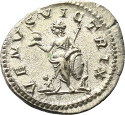 VENVS VICTRIX, Venus, draped, standing left, holding helmet in right hand and transverse sceptre in left hand, leaning on shield; to right and left, seated captives