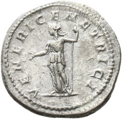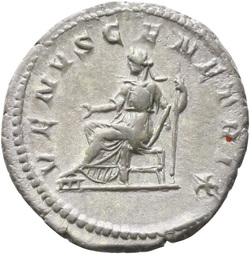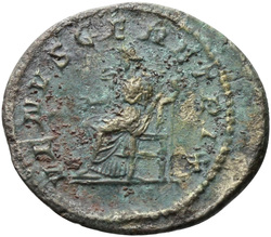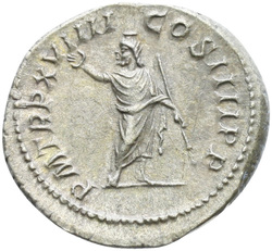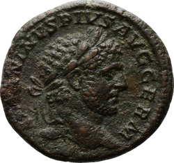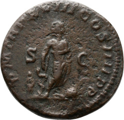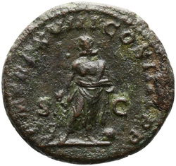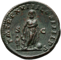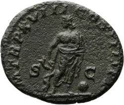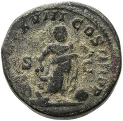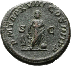 P M TR P XVIII COS IIII P P S C, Asclepius, nude to waist, standing front, head left, holding serpent-wreathed wand in right hand; to left, Telesphorus; on ground, right, globe