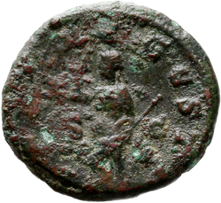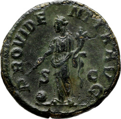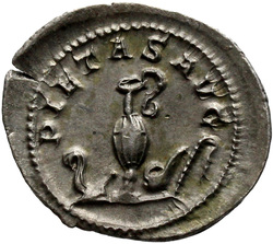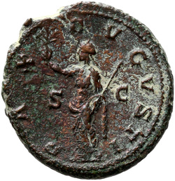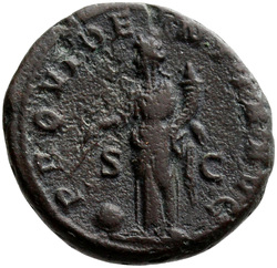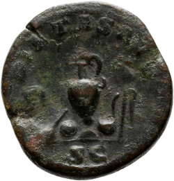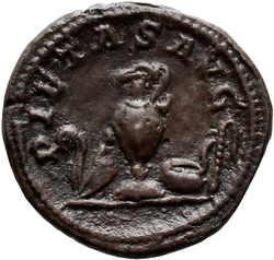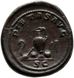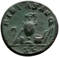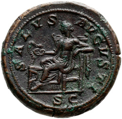 SALVS AVGVSTI S C, Salus, draped, seated left, feeding out of patera in right hand snake coiled round altar and resting left arm on side of chair