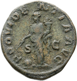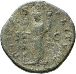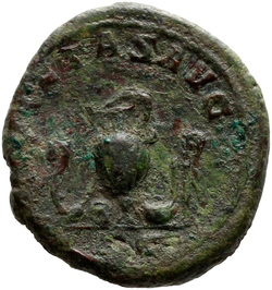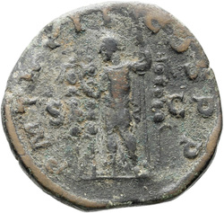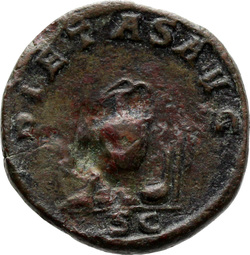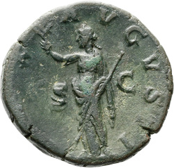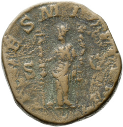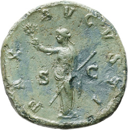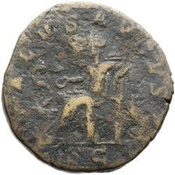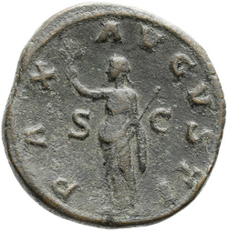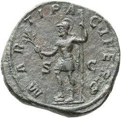 MARTI PACIFERO S C, Mars, helmeted, in military attire, standing left, resting right foot on helmet, holding branch in right hand and spear in left hand