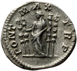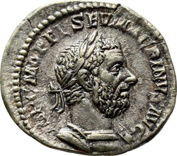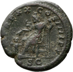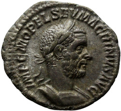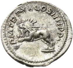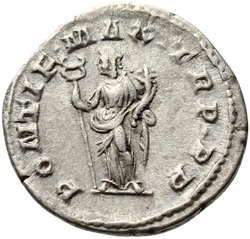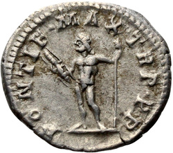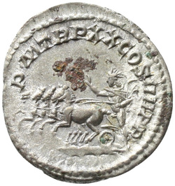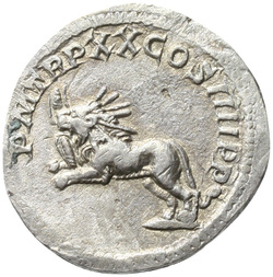 P M TR P XX COS IIII P P // VIC PART (in exergue), Victory, winged, draped, seated right on cuirass and shields, resting left hand on shield set on knees and inscribed with VO XX; before, trophy and two captives