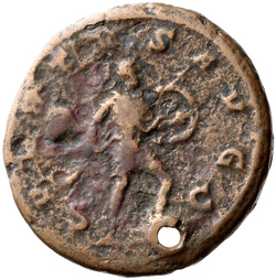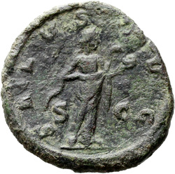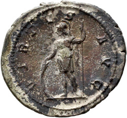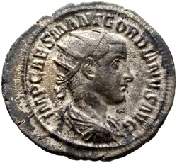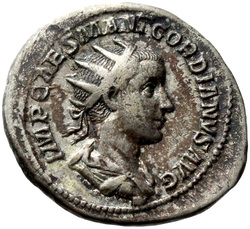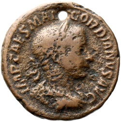 LIBERALITAS AVGVSTORVM S C, Balbinus, Pupienus, and Gordian III, togate, all seated left on curule chairs on platform; behind them, soldier standing left, holding spear; in front of them, Liberalitas, draped, standing left, holding abacus in right hand and cornucopiae in left hand; below, citizen, mounting steps of platform