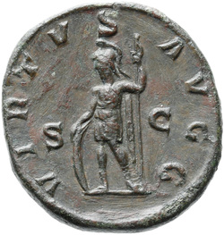 [I]OVI CONSERVATORI S C, Jupiter, nude except for cloak around shoulders, standing front, head left, holding vertical sceptre in left hand and thunderbolt in right hand over Gordian III, togate, standing left