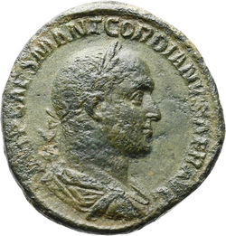 [I]OVI CONSERVATORI S C, Jupiter, nude except for cloak around shoulders, standing front, head left, holding vertical sceptre in left hand and thunderbolt in right hand over Gordian III, togate, standing left