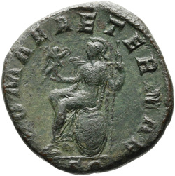 [I]OVI CONSERVATORI S C, Jupiter, nude except for cloak around shoulders, standing front, head left, holding vertical sceptre in left hand and thunderbolt in right hand over Gordian III, togate, standing left