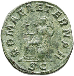 [I]OVI CONSERVATORI S C, Jupiter, nude except for cloak around shoulders, standing front, head left, holding vertical sceptre in left hand and thunderbolt in right hand over Gordian III, togate, standing left