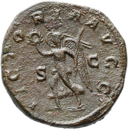 [I]OVI CONSERVATORI S C, Jupiter, nude except for cloak around shoulders, standing front, head left, holding vertical sceptre in left hand and thunderbolt in right hand over Gordian III, togate, standing left