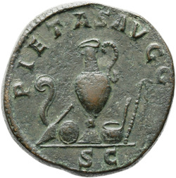 [I]OVI CONSERVATORI S C, Jupiter, nude except for cloak around shoulders, standing front, head left, holding vertical sceptre in left hand and thunderbolt in right hand over Gordian III, togate, standing left