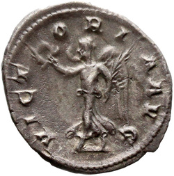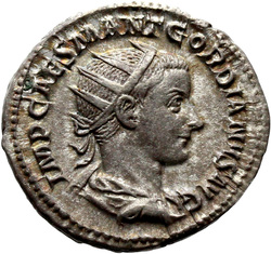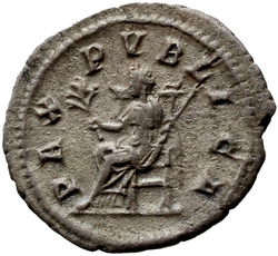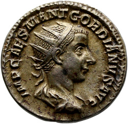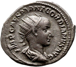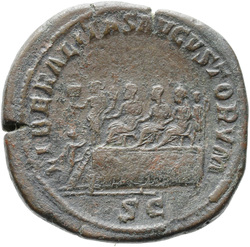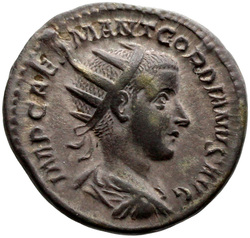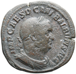 LIBERALITAS AVGVSTORVM S C, Balbinus, Pupienus, and Gordian III, togate, all seated left on curule chairs on platform; behind them, soldier standing left, holding spear; in front of them, Liberalitas, draped, standing left, holding abacus in right hand and cornucopiae in left hand; below, citizen, mounting steps of platform