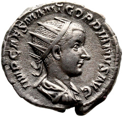 IMP CAES M ANT GORDIANVS AVG, Bust of Gordian III, radiate, draped, cuirassed, right
