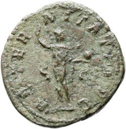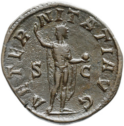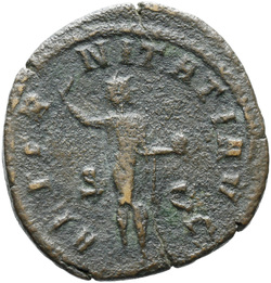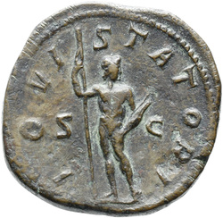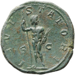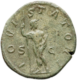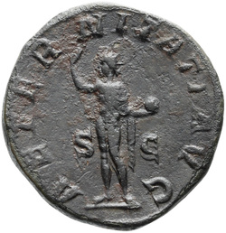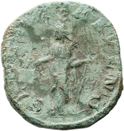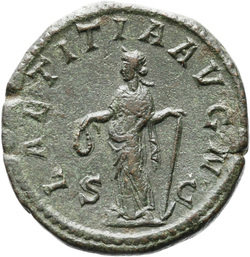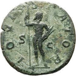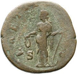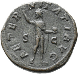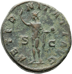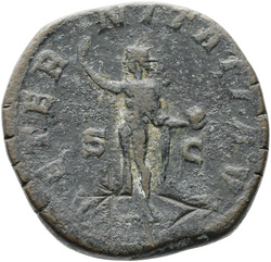 AETERNITATI AV[G] S C, Sol, nude except for cloak around shoulders, standing front, head left, raising right hand and holding globe in left hand