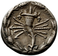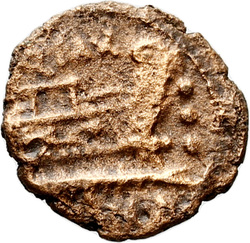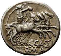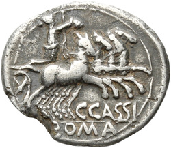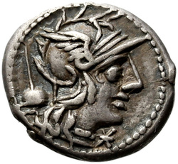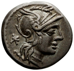 X (crossed), Helmeted head of Roma, right; behind, denominational mark. Border of dots.