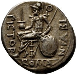 MN·ACILI, Jupiter, holding spear in left hand and thunderbolt in right hand, in quadriga right driven by Victory, holding reins in left and whip in right hand; below, shield. Border of dots.