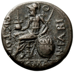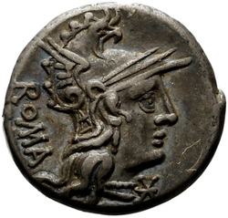 BALBVS ROMA X (crossed), Helmeted head of Roma, right; around, laurel-wreath.