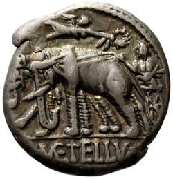 MN·ACILI, Jupiter, holding spear in left hand and thunderbolt in right hand, in quadriga right driven by Victory, holding reins in left and whip in right hand; below, shield. Border of dots.