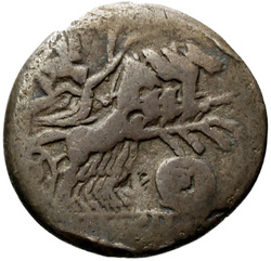 MN·ACILI, Jupiter, holding spear in left hand and thunderbolt in right hand, in quadriga right driven by Victory, holding reins in left and whip in right hand; below, shield. Border of dots.