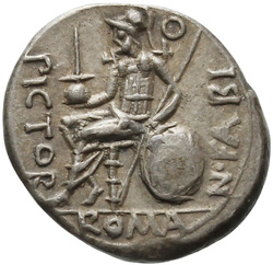 MN·ACILI, Jupiter, holding spear in left hand and thunderbolt in right hand, in quadriga right driven by Victory, holding reins in left and whip in right hand; below, shield. Border of dots.