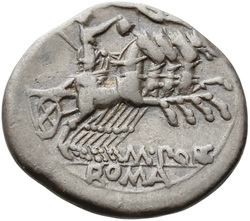 MN·ACILI, Jupiter, holding spear in left hand and thunderbolt in right hand, in quadriga right driven by Victory, holding reins in left and whip in right hand; below, shield. Border of dots.