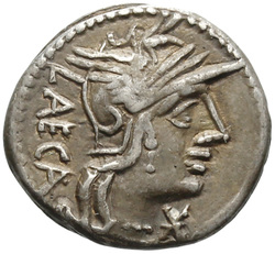 MN·ACILI, Jupiter, holding spear in left hand and thunderbolt in right hand, in quadriga right driven by Victory, holding reins in left and whip in right hand; below, shield. Border of dots.