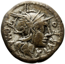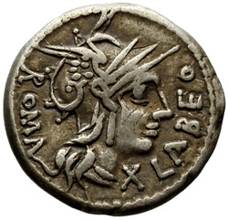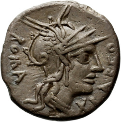 BALBVS ROMA X (crossed), Helmeted head of Roma, right; around, laurel-wreath.