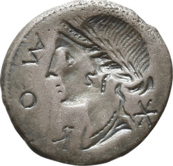 ROMA X (crossed), Laureate female bust right (possibly Roma), draped and wearing diadem; behind, denominational mark. Border of dots.