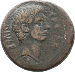 M·ANTONIVS·M·F·M·N·AVGVR·IMP·TERT, M. Antonius standing right, togate and wearing veil, holding lituus in right hand; around, inscription. Border of dots.