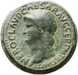 NER[O CLAVDI]VS CAESAR AVG GER P M TR P IMP P P, Head of Nero, laureate, right, with aegis on neck