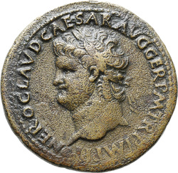 NERO CLAVD CAESAR AVG GER P M TR P [I]MP P P, Head of Nero, laureate, right; small globe at point of neck