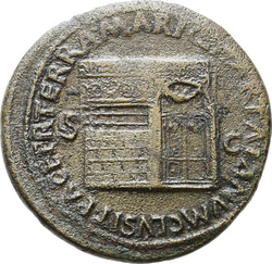 CONG I DAT [POP] S C, Nero, bare-headed and togate, seated right on high platform on left, holding roll in left hand; before him, an official seated right on platform, handing congiarium to togate citizen with small boy behind him; in background, Minerva, standing facing, head left, holding an owl in right hand and spear in left, and Liberalitas on right, holding tessera in right hand