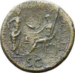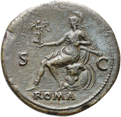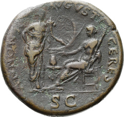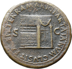 S C, Triumphal arch, showing garlanded front and left side; above, the Emperor in a quadriga escorted by Victory, holding wreath and palm, on right and Pax, holding caduceus and cornucopiae, on left; just below the quadriga on extreme left and right, two small figures of soldiers; on left side of arch in a niche, Mars, helmeted, standing facing, holding spear in right hand and round shield in left hand a round; ornamental reliefs on the faces and plinths of the arch