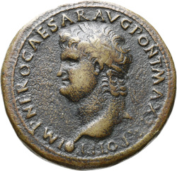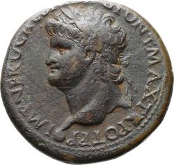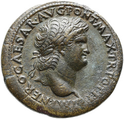 IMP NERO CAESAR AVG PON[T] MAX TR POT P P, Head of Nero, laureate, left; small globe at point of neck