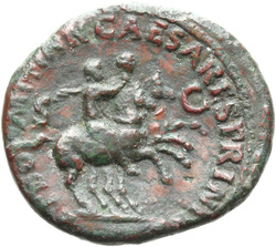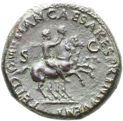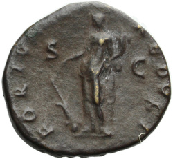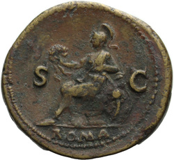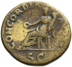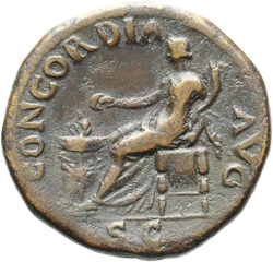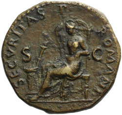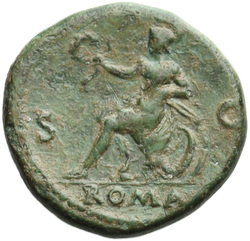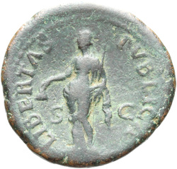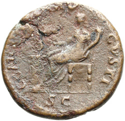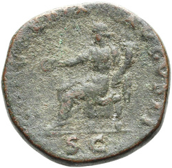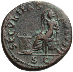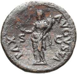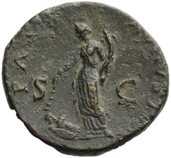 PAX[S] AVGVST S C (in field), Pax, draped, standing at angle to left, holding cornucopia in left hand and setting fire to pile of arms with torch with right