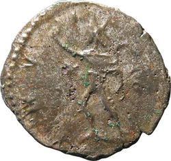 ROMA S C, Roma, helmeted, in military dress, seated left on cuirass, right foot on helmet, holding Victory in extended right hand, left arm on parazonium at side: behind her on right, two round shields