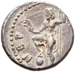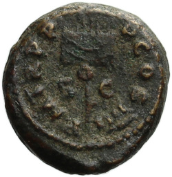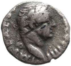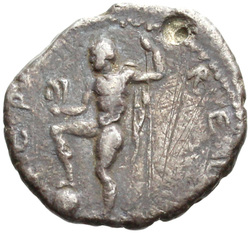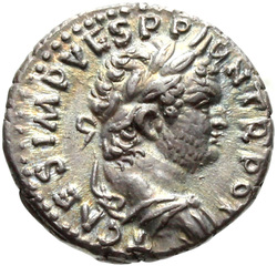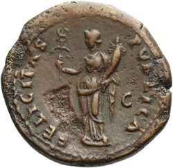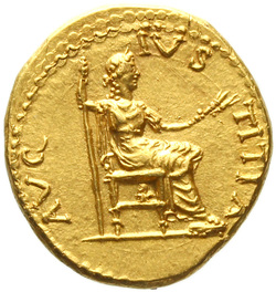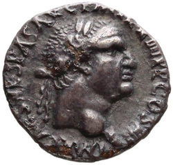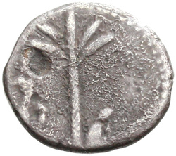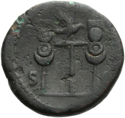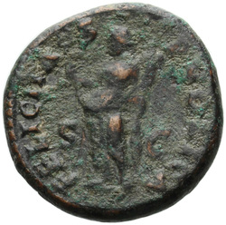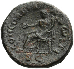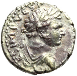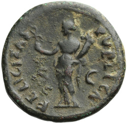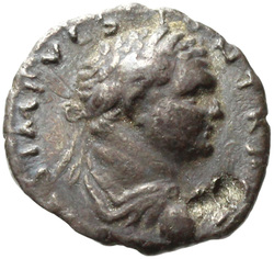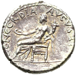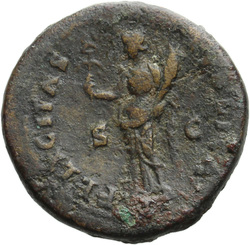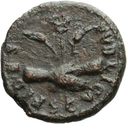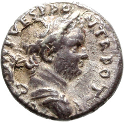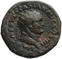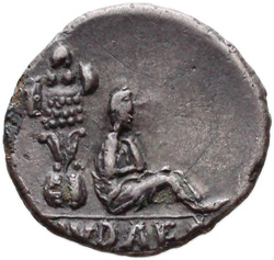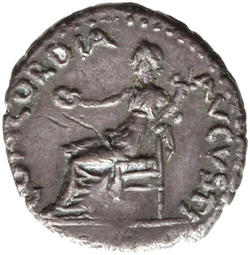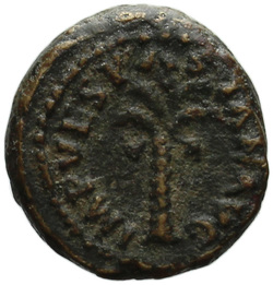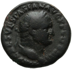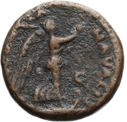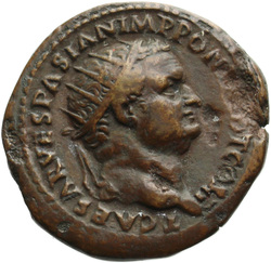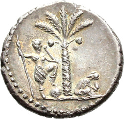 Judaea, veiled, draped, seated right under palm-tree, in attitude of mourning; behind palm, Vespasian, in military dress, standing right, right foot on helmet, holding vertical spear in right hand and parazonium in left