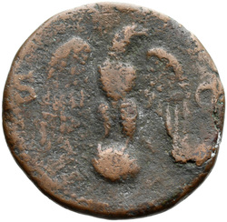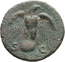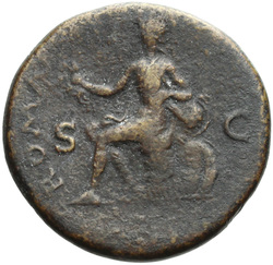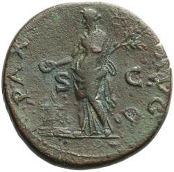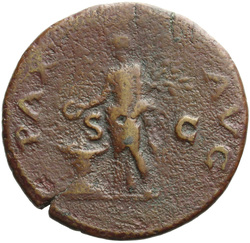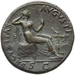 SECVRITAS AVGVSTI S C, Securitas, draped, seated right, resting head on right hand, right arm resting on back of chair, holding vertical sceptre in left hand; in front of her, lighted, garlanded altar, against which rests torch