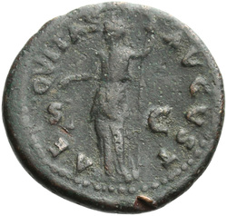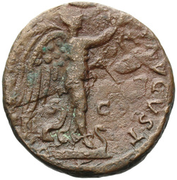 IVDAEA [C]APTA S C, Vespasian standing, holding spear and parazonium, left of palm-tree, resting foot on helmet; Judaea seated right on cuirass
