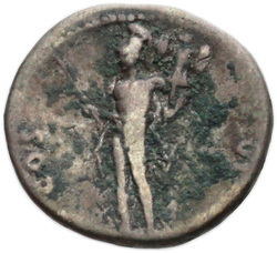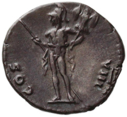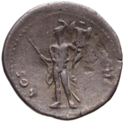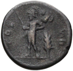 COS VIII, Mars, helmeted, naked except for cloak round waist, standing left, holding spear slanting upwards in right hand and trophy on left shoulder in left; corn-ear upright in ground, on right
