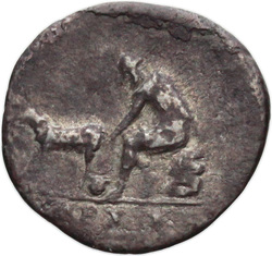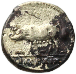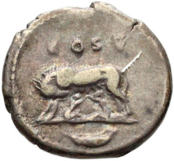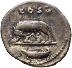 COS VI, Roma, helmeted, in military dress, seated right on two oval shields, feet set together, holding transverse spear in left hand, right hand on lap; to right and left, eagle flying; on ground right, miniature she-wolf and twins