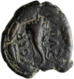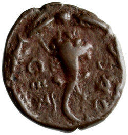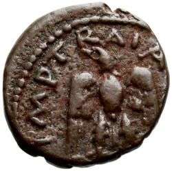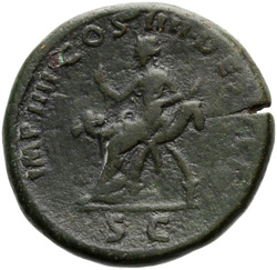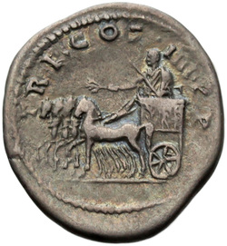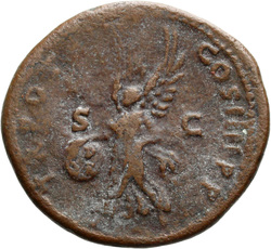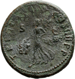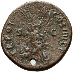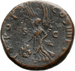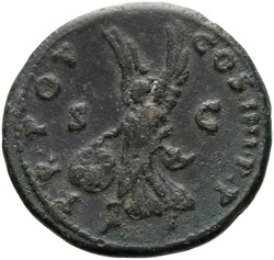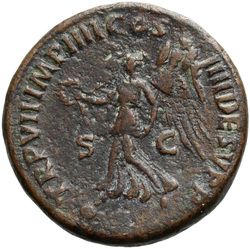 TR P VII IMP IIII COS IIII DES V P P S C, Victory, draped, alighting with right foot on globe left, holding up wreath in right hand and trophy in left
