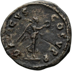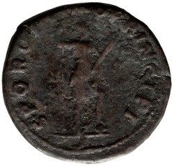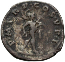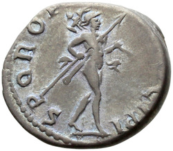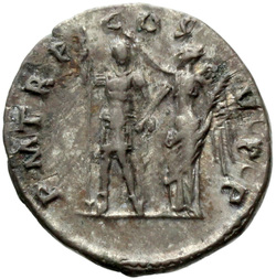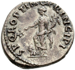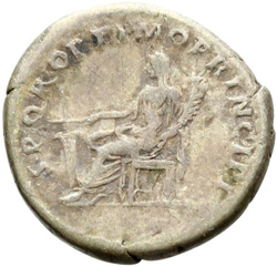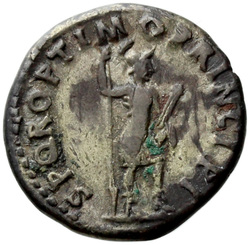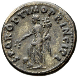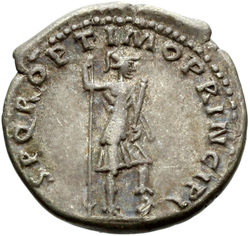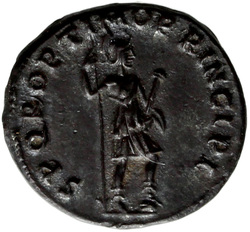 S P Q R OPTIMO PRINCIPI, Virtus, helmeted, in military dress, standing right, left foot set on helmet, holding straight spear, inverted, in right hand and parazonium upwards in left
